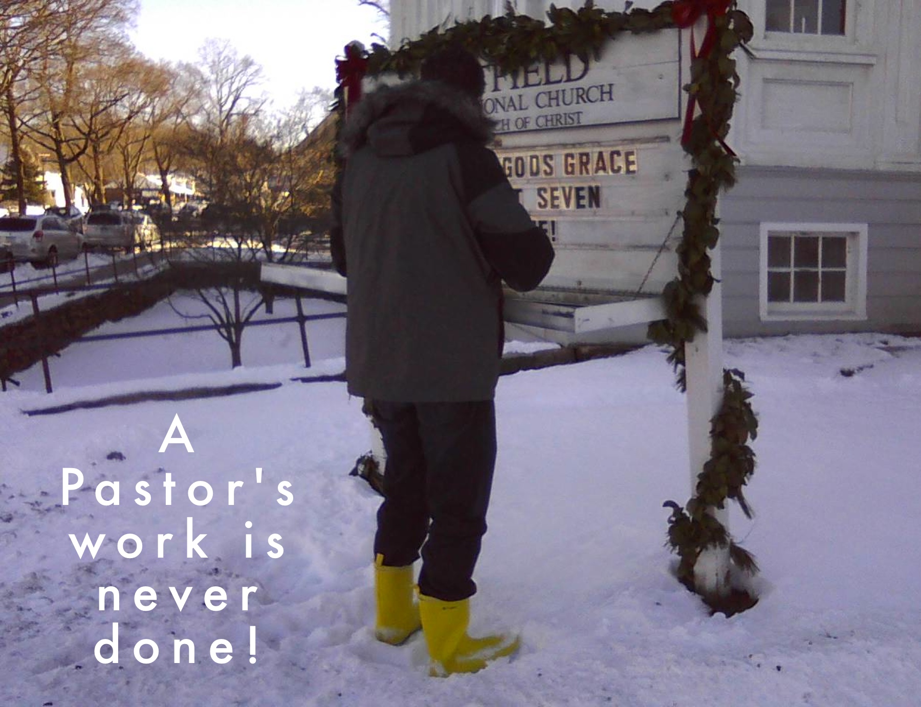 Taken by our sweet Westfield secretary who thought it was rather humorous that I was changing the sign in 10 degree weather with no gloves! Our current sign might be the devil incarnate. When it’s time to change the sign, you end up spending a lot of time fiddling–with the old letters to get them out, with the new letters to get them in, with the key to unlock the glass, with the key to lock it back, and so on. And that’s the problem with putting up a message with dates. Once those dates or times have passed, you GOTTA change it. Luckily, I happen to have a very striking pair of yellow galoshes that make this project bearable in more than one way.
