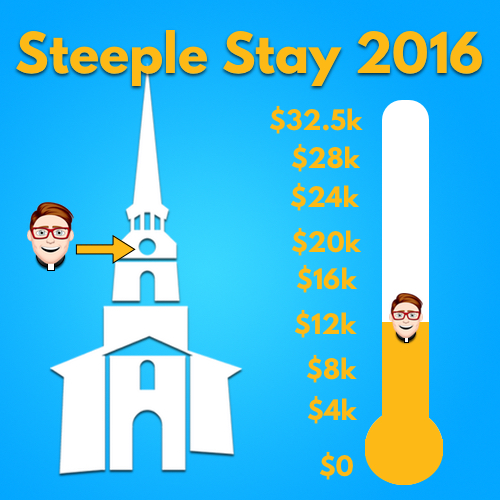During the week leading up the event, I made a series of graphics to mark our progress during Steeple Stay 2016. As money went up, Pastor Jon went down (at least, that was the idea). I won’t lie to you: I couldn’t keep up. I made it to my perch about 2/3 of the way up the steeple, and texted the ground for total donations. Within 40 minutes of beginning the day, we had raised $4,000. By 9am, we had already raised more than $12,000. The day before, we revealed that an anonymous donor had offered to match all gifts made between 7am and 10 am dollar for dollar up to $10,000. Who would’ve ever thought we’d blow past that goal in under two hours? Luckily, they extended it, adding an additional $7,000. We hit that LESS THAN AN HOUR LATER. No kidding!