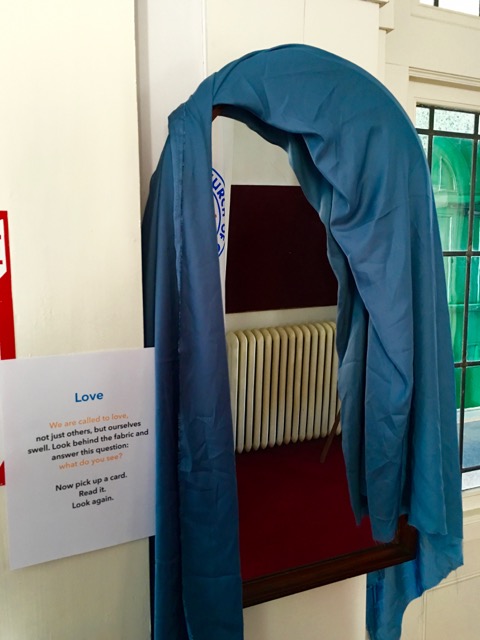 This station featured a mirror covered with fabric. Church members were asked to lift the fabric and reflect (ha!) on what they see. Then, pick up a card with Genesis 1:27 printed on. Then look again. The instruction card posted at the station read this way: