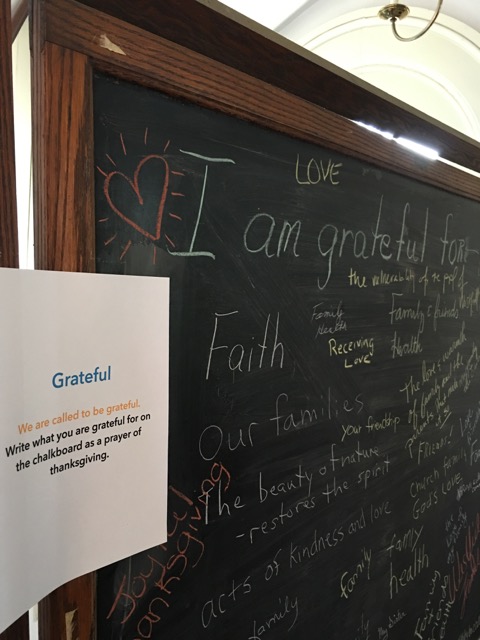 Our old church is blessed with lots of old things, one of the most charming of which is this old chalk board. A couple of folks hauled it up from the ground floor and placed it in our Narthex and wrote across the top, “I am Grateful for…” Next to the board was a basket of chalk. The goal was simple: write what you are grateful for.