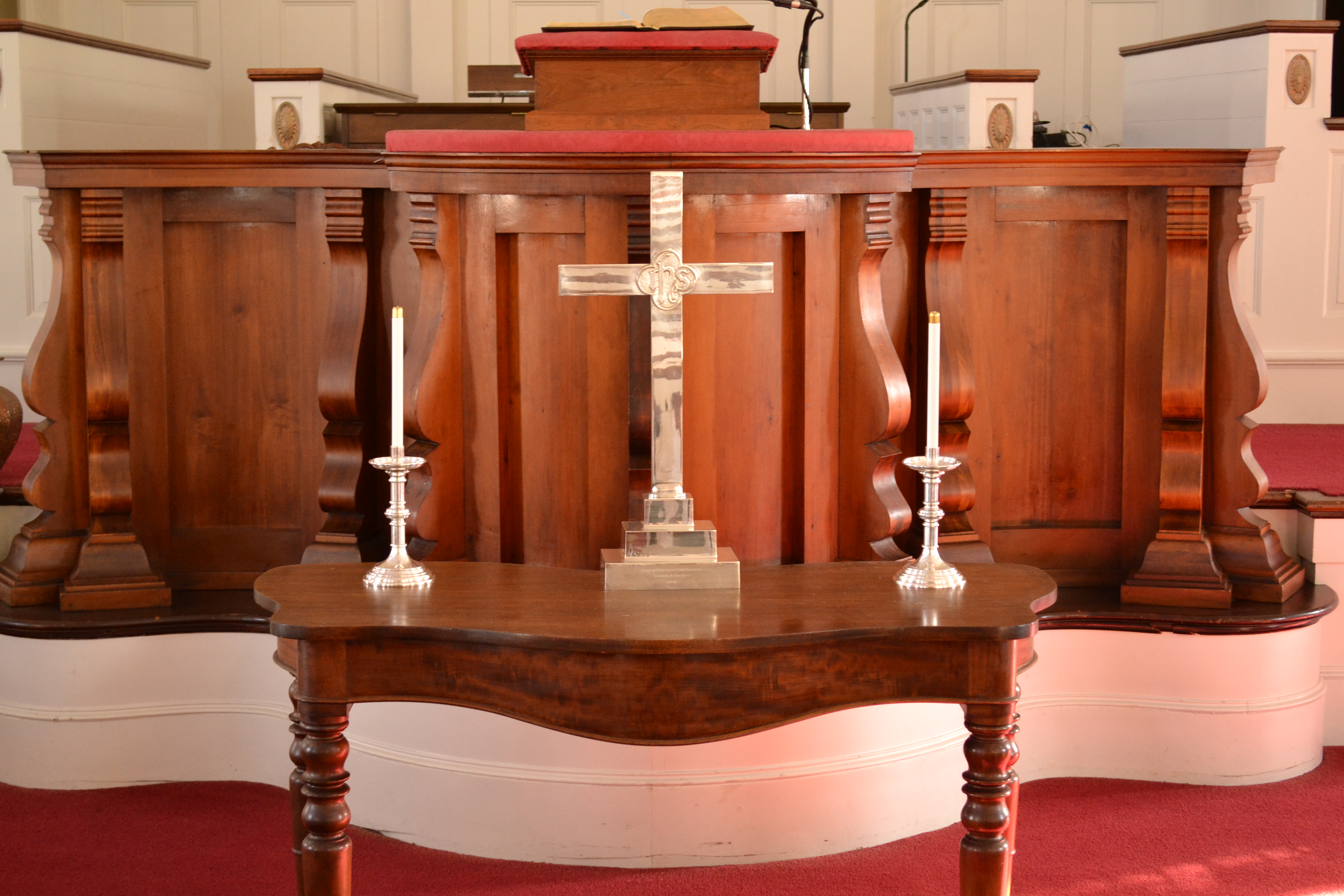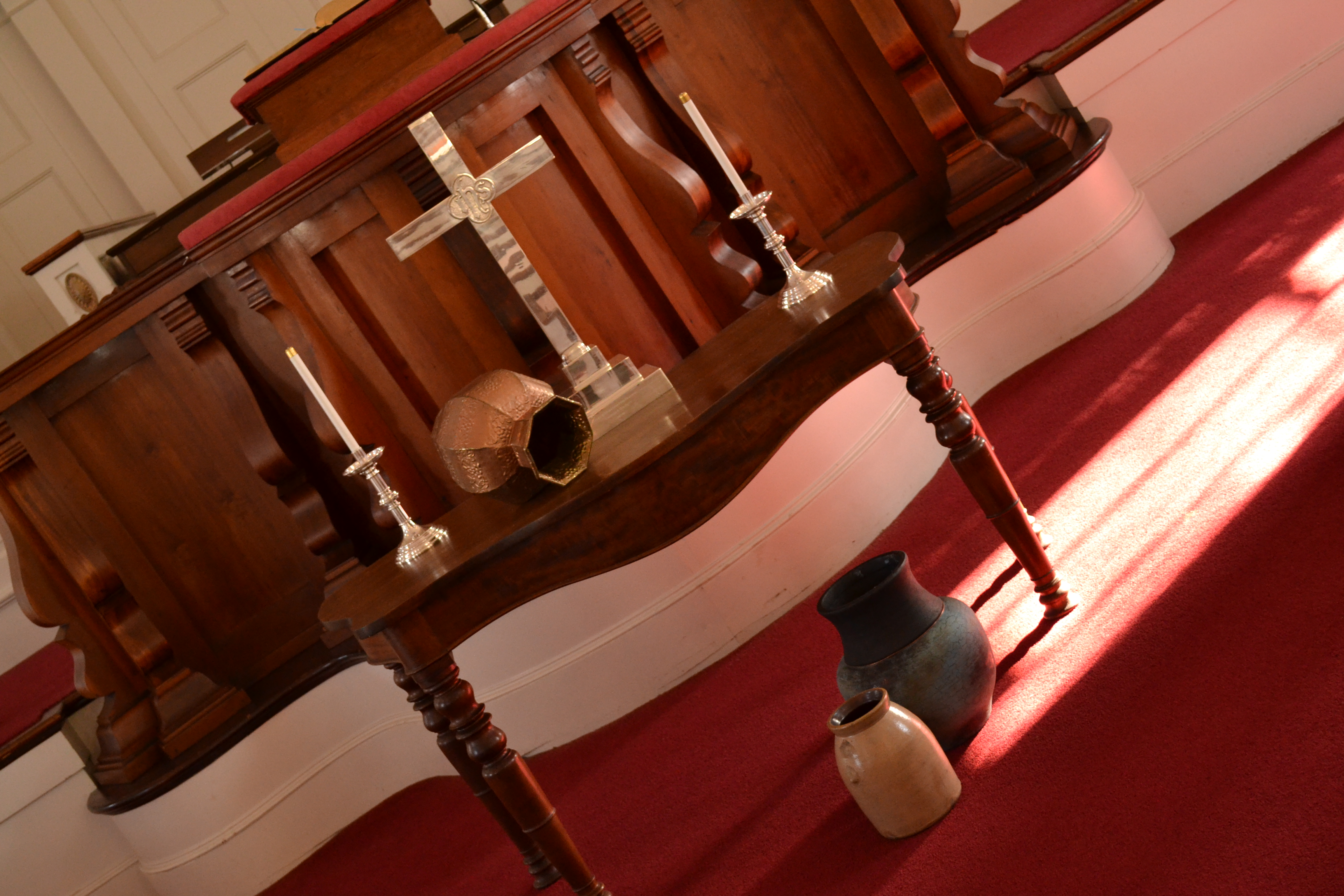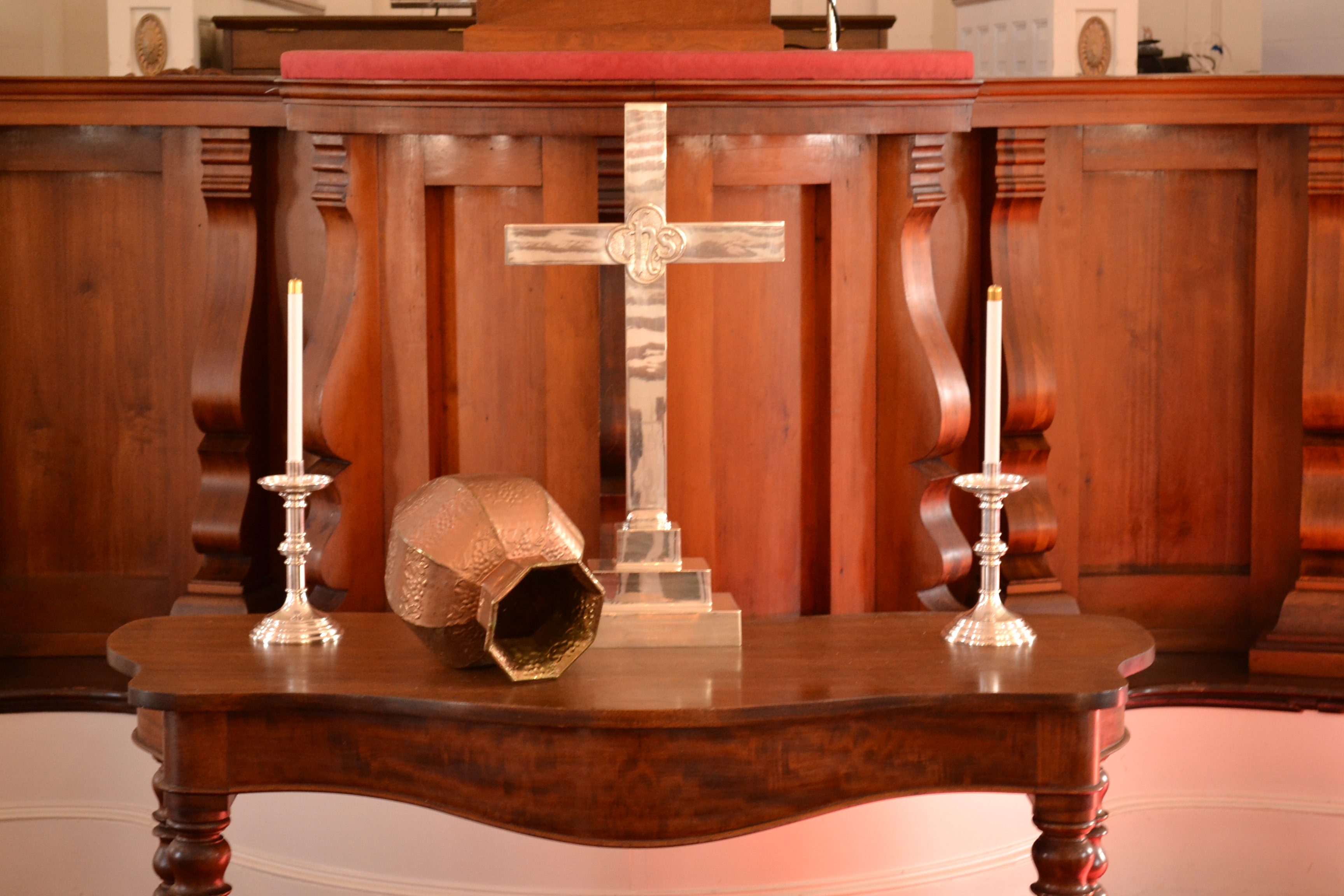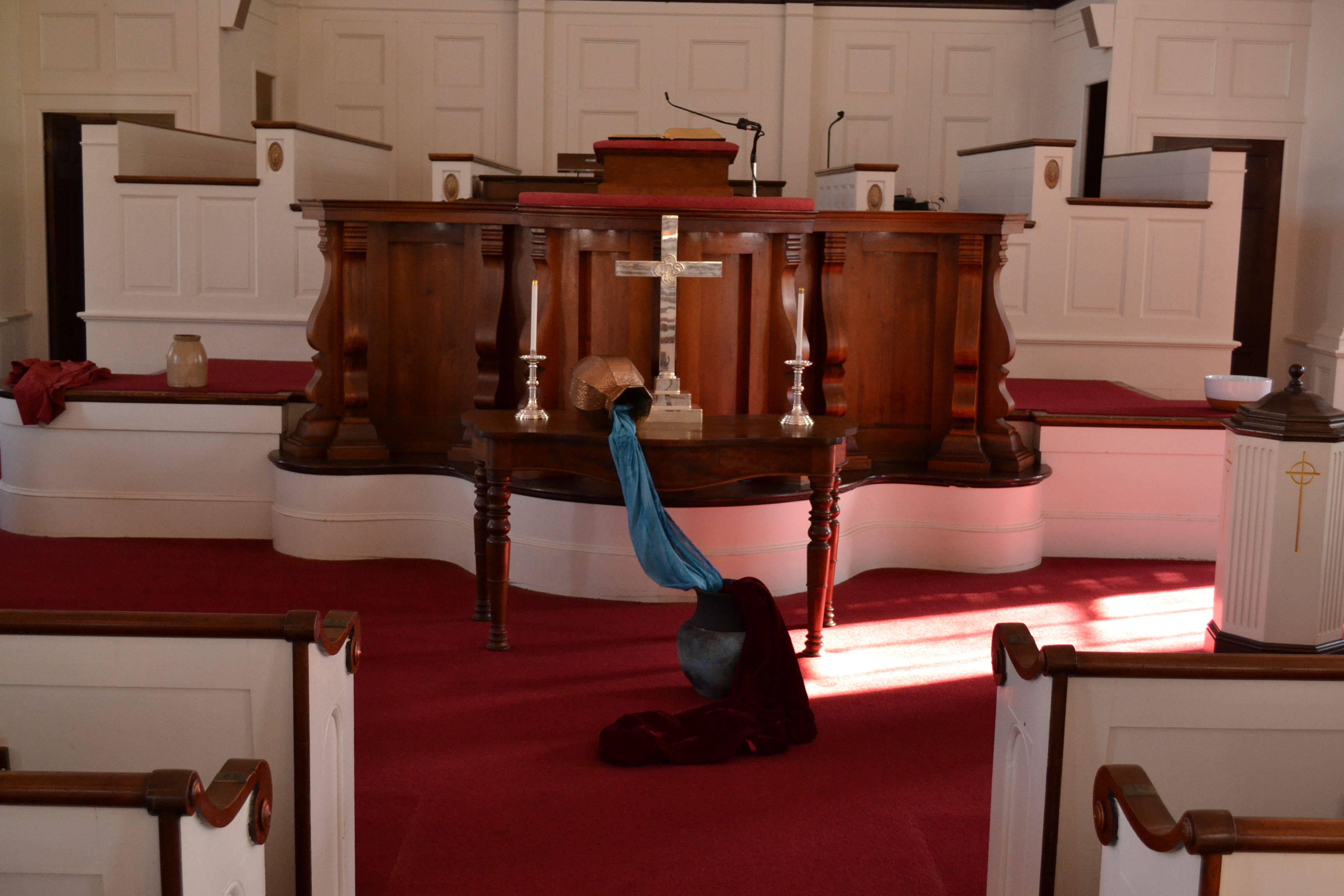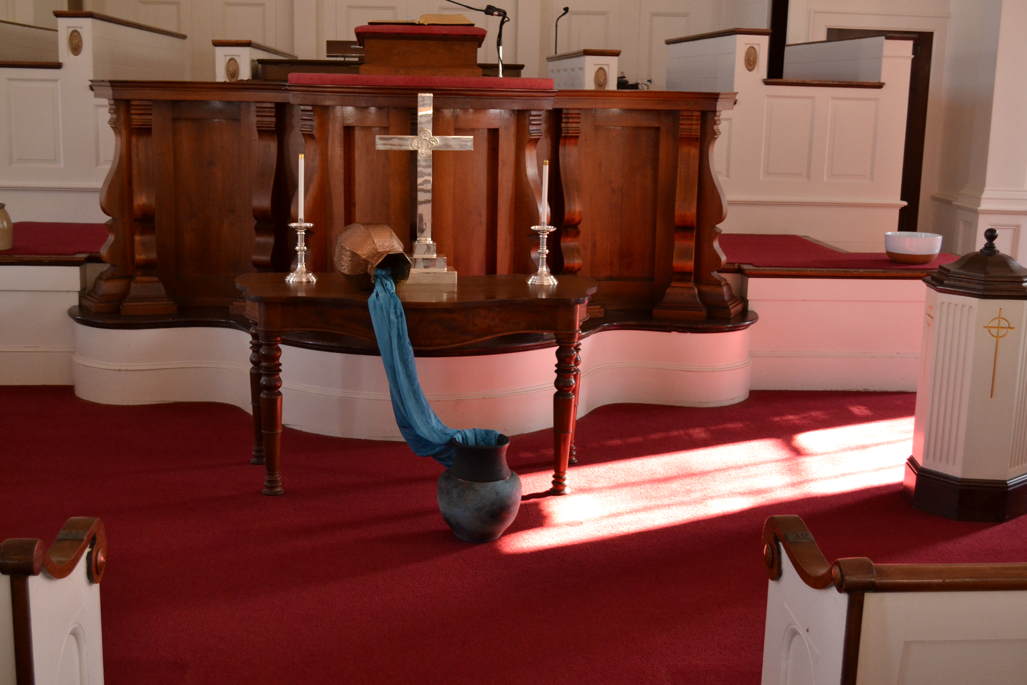 At Westfield, we’ve got two communion tables: the old communion table (pictured below) and the new communion table. I love the curved edges and dark wood of the old table, so I chose to use it for this altarscape. After a long absence, the silver candlesticks and cross have returned. It was important to me to keep those elements on the table this week so that those who miss these symbols of the faith could see them there.