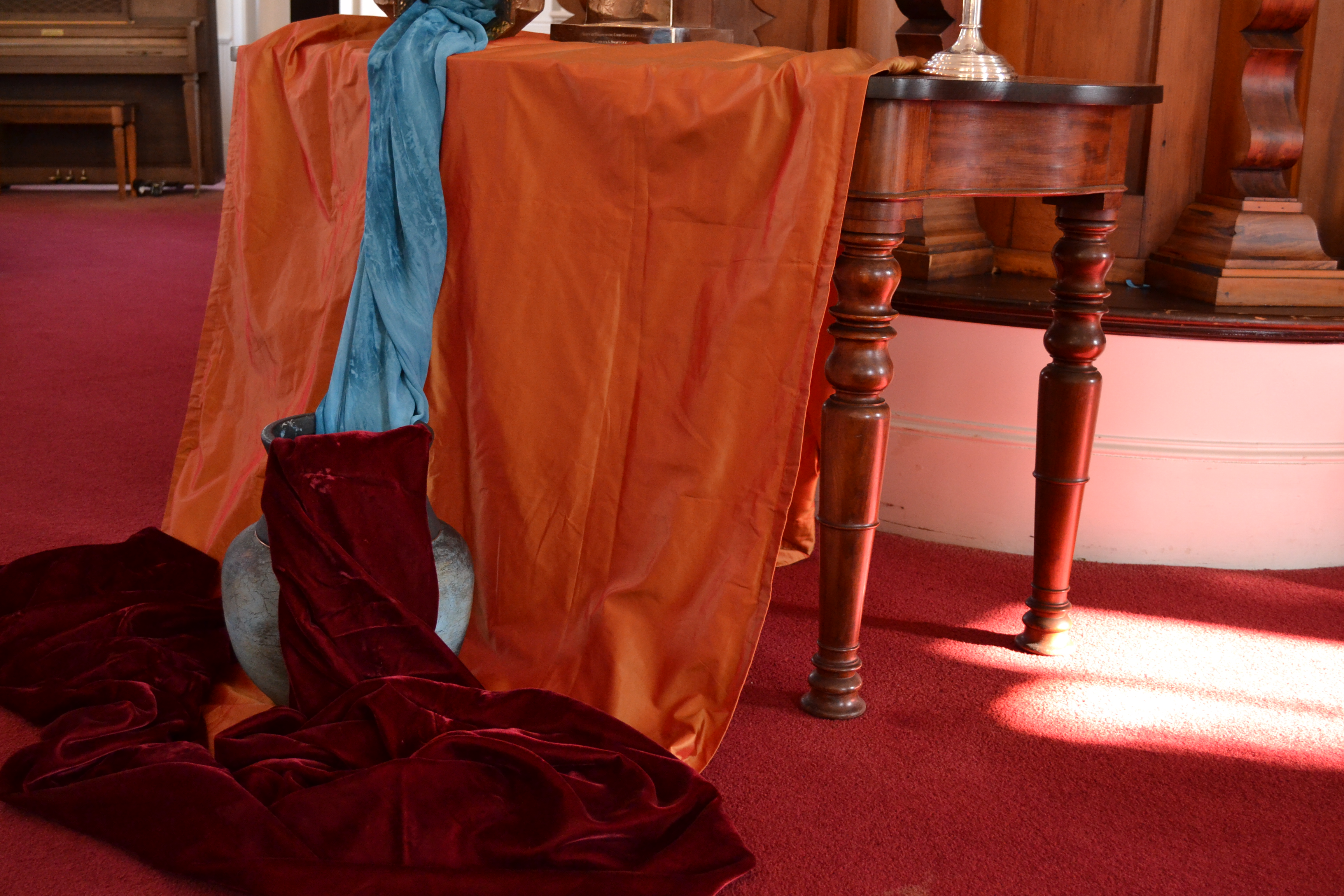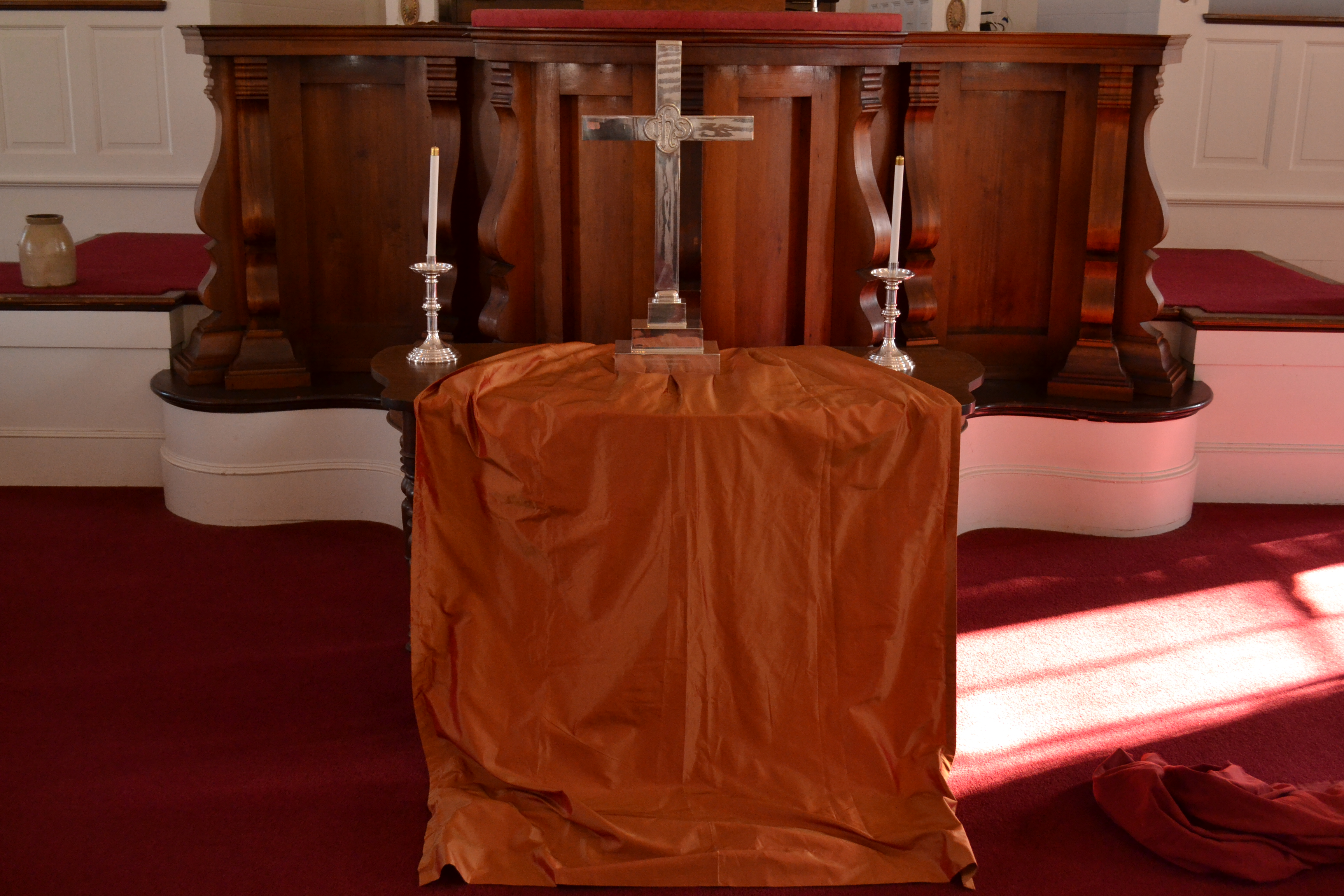 The orange drape, while not my first choice (actually, it was my only choice) does grab the eye upon entering the sanctuary.