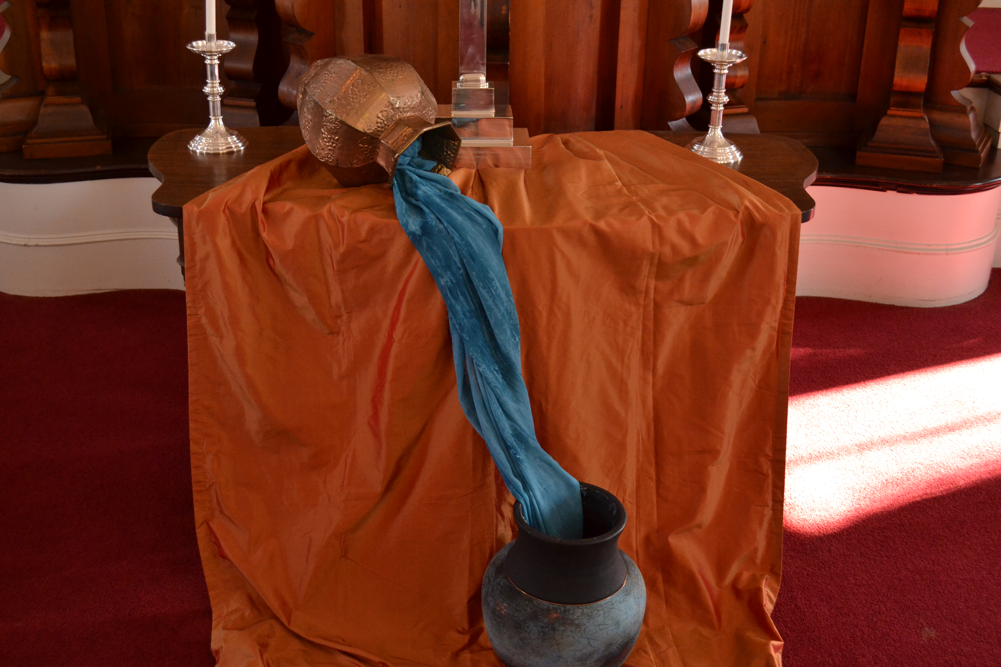 Now, it’s time to add my favorite altarscape-making resource: FABRIC. The miracle at Cana involved Jesus turning water into wine. So the idea for this altar is to turn the blue fabric to deep red. After taking a step back it became clear less is more when it comes to altar jugs. (I’ll add that to the top ten statements I never thought I’d type!)