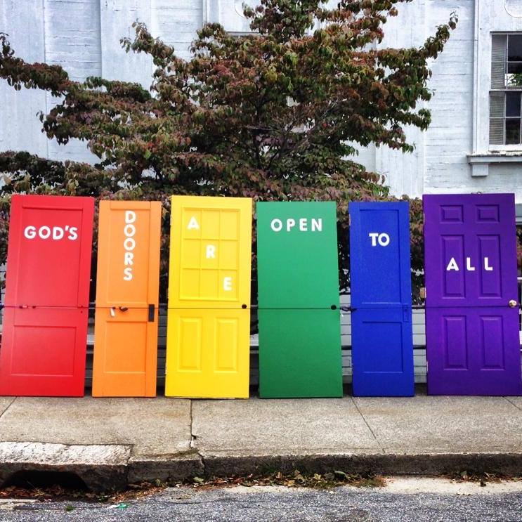Two Septembers ago, we debuted God’s doors. They’re our rainbow doors that we lug in and out of the church every time there’s a big town event. We put them along the Reynolds Street railing or on our front steps. Each door has its own word, and when they’re lined up they read, “God’s doors are open to all.” We had become Open and Affirming (in churchspeak, ONA) in June of 2014. It’s a UCC (United Church of Christ) designation that means we welcomes everyone specifically our Lesbian, Gay, Bisexual, and Transgender sisters and brothers, and we wanted a way to let others know that when we say everyone is welcome, we mean it.