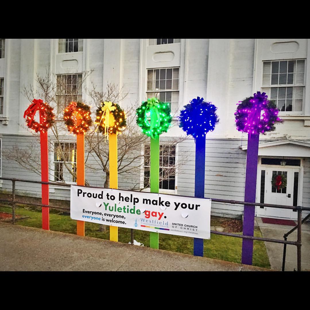 So, we found six old doors, painted them up and put them out. And the response has been tremendous. They’ve been highlighted by a national non-profit working to renew the mainline church; they’ve been replicated across the country—Illinois, Iowa, Rhode Island to name a few places churches were directly inspired by our own. They’ve even gone out on tour—right now they’re in Mansfield, soon they’re headed to Ledyard. Since they’re on tour, our Fellowship and Development board members, Anna and Allison, decided we needed something like that for the holidays. And so we brainstormed and came up with our wreaths—each on a different colored stand with matching lights and bow. And a very witty and punny sign that reads, “Proud to help make your Yuletide Gay.”